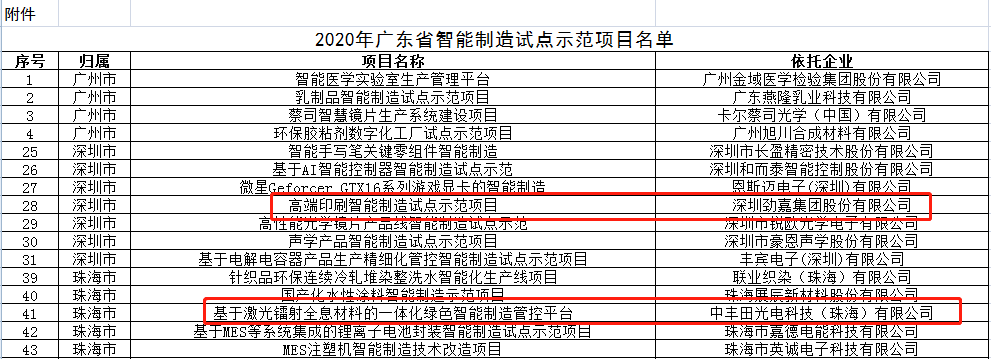 春种一粒粟,秋收万颗子。立秋刚过,喜讯飞传:我司“基于激光镭射全息材料的一体化绿色智能制造管控平台”与集团公司“高端印刷智能制造试点示范项目“双双成功入选“2020年广东省智能制造试点示范项目”。